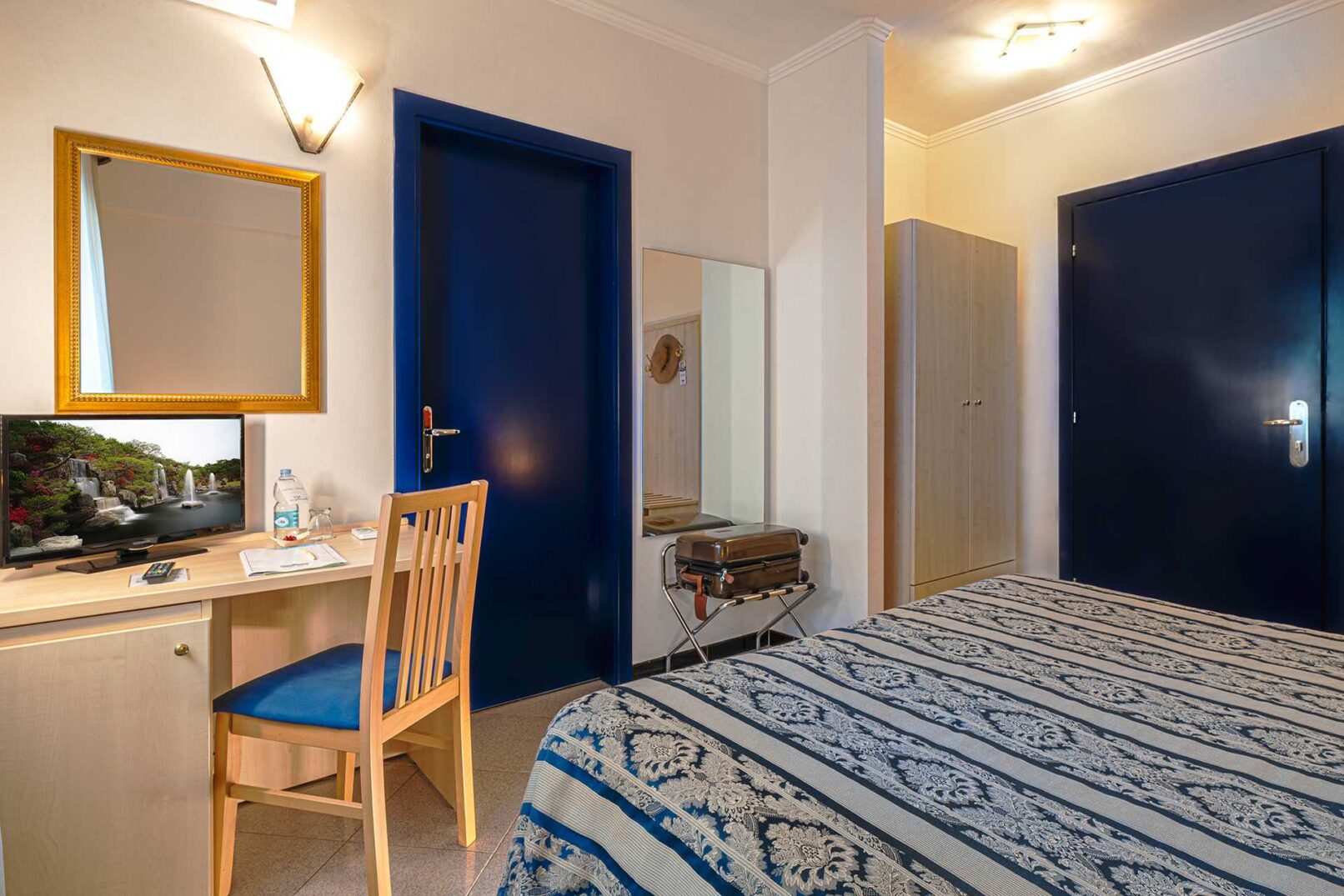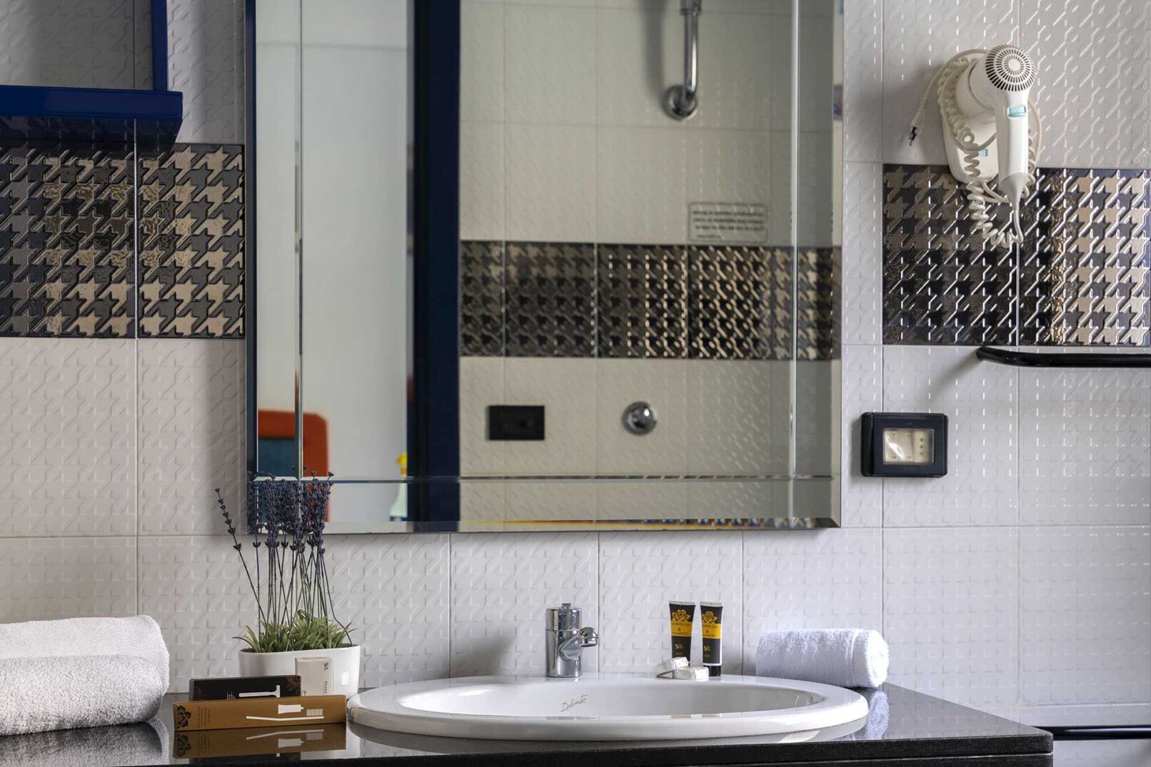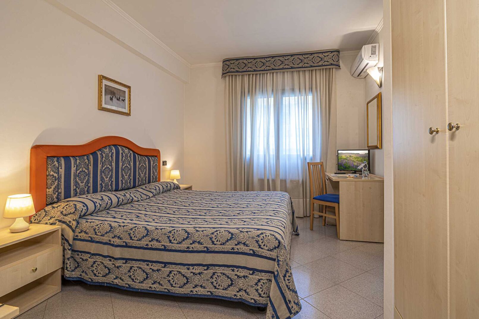 Ampia circa 15 mq, dispone di letto matrimoniale 150×190, scrivania con TV LED 24”, minibar, aria condizionata, bagno di 4mq con doccia, lavabo con top in granito, bidet, WC, asciugacapelli, set bagno in spugna, set di cortesie.